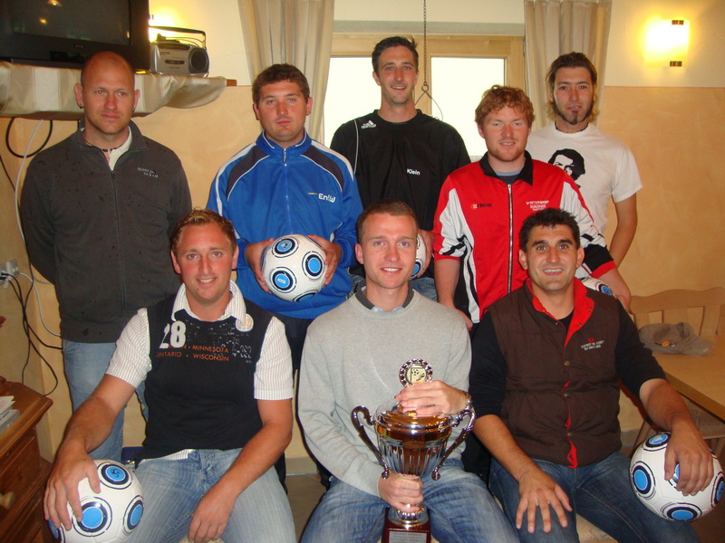 | Die Spielführer der teilnehmenden Mannschaften des Dinner-Stadler-Gedächtnisturniers mit SVW-Spartenleiter Stephan Andert (links hinten stehend) und 2. Abt.Leiter Christoph Böhm (rechts hinten stehend). |