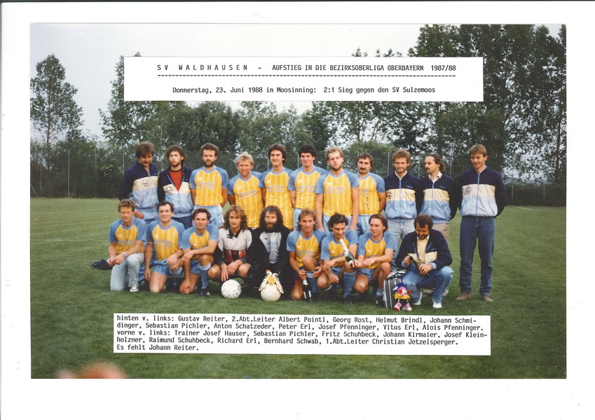 Das Foto zeigt ihn im Entscheidungsspiel am Donnerstag, 23.06.1988 in Moosinning gegen den SV Sulzemoos, das unsere Elf mit 2:1 gewann und damit die Sensation perfekt machte. |