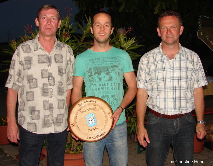 | Die Saisonabschlussfeier nahmen die Vereinsvorstände des SV Waldhausen Josef Pfenninger und Edwin Kirmaier zum Anlass einen verdienten Spieler im SVW-Trikot zu ehren. 250 Spiele absolvierte Florian Mühlegger für den Verein und erhielt zum Dank ein Erinnerungsteller. |