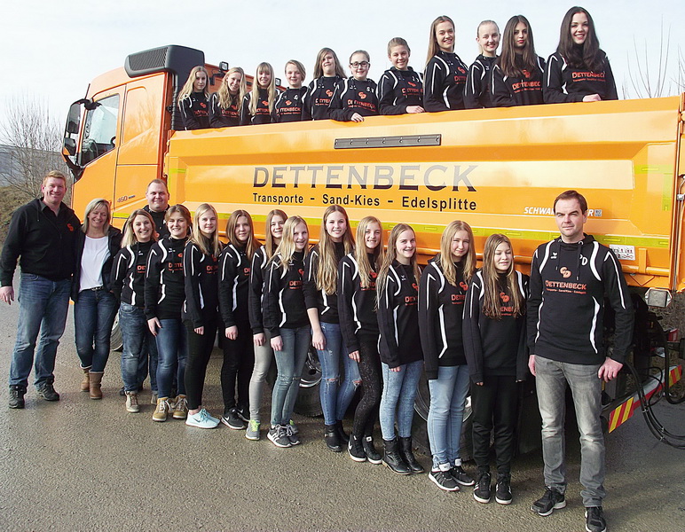 Die B-Juniorinnen-Spielgemeinschaft SG Waldhausen/Schnaitsee freut sich über eine großzügige Spende für die aktiven Fußballerinnen. Georg Dettenbeck der in Schnaitsee ein Fuhrunternehmen betreibt, hat für die B-Juniorinnen schwarze Aufwärmpullis gesponsert. Die Firmeninhaber Georg und Claudia Dettenbeck stellten sich auf ihrem Firmengelände mit dem Trainerteam Martin Linner, Cilli Kern (beide SVW) Peter Dinner (TSV Schnaitsee) und der gesamten Mannschaft dem Fotografen. |